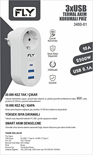 Fly FLY 3400 Termal Akım Korumalı, Çocuk Korumalı, 2 x USB Type-C, 1 X USB Type-C, Tekli Priz, Beyaz