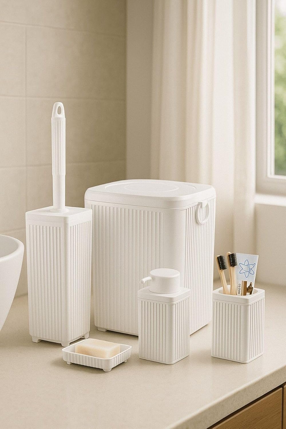 Serisi Beyaz Banyo Seti, 5 Parça Akrilik Kare 5 Litre Çöp Kovası, Sabunluk, Fırçalık Takımı 34 Beyaz