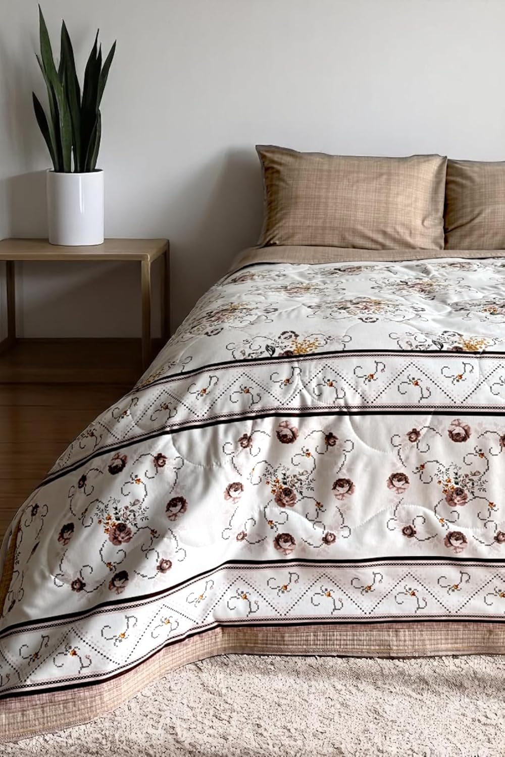 Çift Kişilik Yazlık Uyku Seti | Düz Çarşaflı | Kanaviçe Sütlü Kahve AT7324
