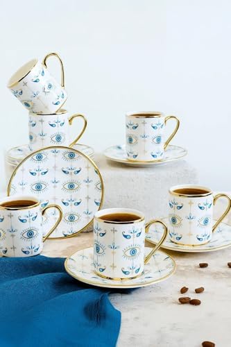 Altın Yaldızlı Nazar Göz Desenli 6 Kişilik Porselen Fincan Takımı – 12 Parça Şık Sunum Seti Evil Eye