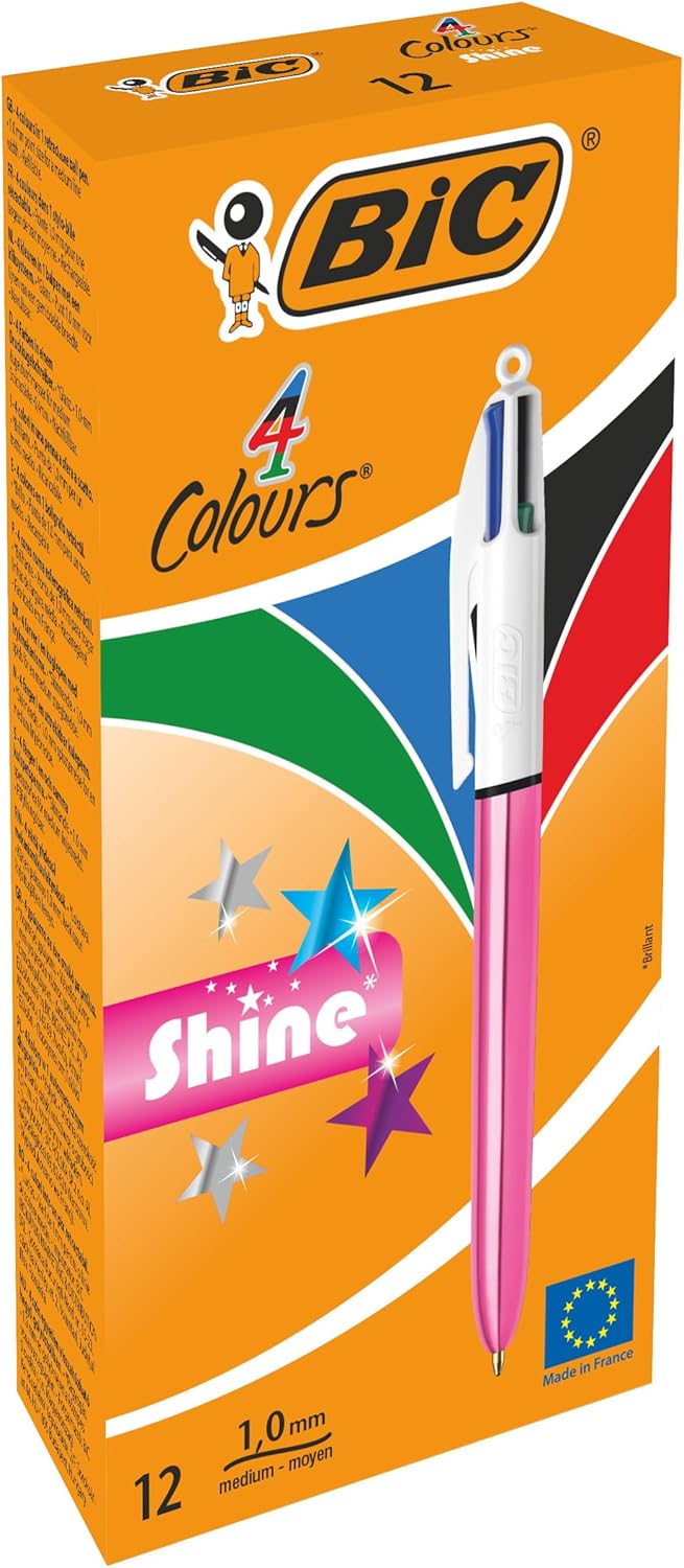4 Colours Pembe Gövde Tükenmez Kalem 12'li Kutu, 4 Renk (Mavi, Siyah,Yeşil ve Kırmızı), 1.0 mm. Uç