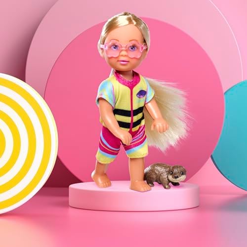 12 santimetre boyundaki Evi mavi kask, pembe güneş gözlüğü takıyor ve elinde sarı kürek tutuyor 105733698, Evi Kayak Eğlencesi, Aksesuarlı, Su Samuru Figürü, Kano, Özel Kıyafetli ve Aksesuarlı, 12 Cm