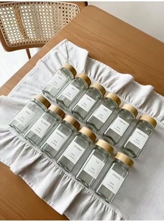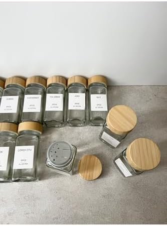 12’Li Bambu Kapaklı Kare Formlu Cam Baharatlık Seti / 16 Adet Etiket İle Gönderilir.