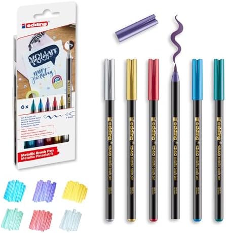 Bu fırça uçlu kalemler açık ve koyu renkli kağıt üzerinde, hand lettering, güzel yazı, çizim, eskiz ve tasarımlarda efektler ortaya koymaya yardımcı olur Set altın, gümüş, metalik kırmızı, metalik yeşil, metalik mavi ve metalik mor renklerinde 6 adet 1340 metalik fırça uçlu kalem içerir Konuk defterleri, doğum günü kartları, yılbaşı kartpostalları, albümler ve bullet journal gibi hobi projeleri için kalemler Mürekkebi kokusuzdur ve kağıdın arkasına geçmez Altın, gümüş, metalik kırmızı, metalik mavi, metalik yeşil ve metalik mor olmak üzere 6 renk 1340 metalik fırça uçlu keçeli kalem, 6 parlak renkli set, esnek fırça ucu