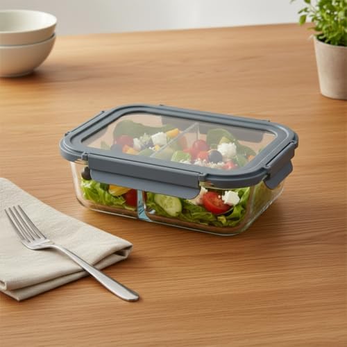 1500 ML Büyük Boy İki Bölmeli Cam Saklama Kabı, Sızdırmaz Kilitli Kapaklı Yemek Beslenme Kutusu, Fırına Girebilen Borosilikat Cam Lunch Box Sefer Tası