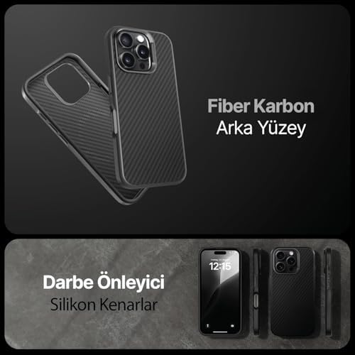 16 Pro Max için Fiber Karbon Materyal Arka Bölüm Metal Lens Çerçeveli ve Metal Tuşlu Sararmayan ve Çizilmeyen Güçlü Darbe Emici Premium Silikon Kılıf (Çöl Titanyum, 16 Pro Max)