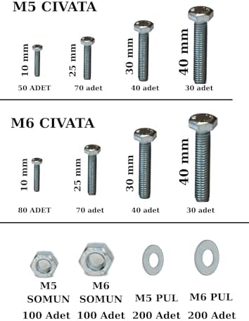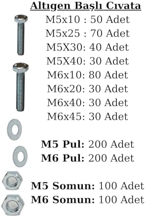 SET İÇERİĞİ : M5x10 Altıgen Başlı Cıvata M5X25 Altıgen Başlı Cıvata : 50 adet M5X30 Altıgen Başlı Cıvata : 70 adet M5X40 Altıgen Başlı Cıvata : 40 adet M6X10 Altıgen Başlı Cıvata: 30 adet M620 Altıgen Başlı Cıvata : 80 adet M6X40 Altıgen Başlı Cıvata: 30 adet M6X45 Altıgen Başlı Cıvata: 30 adet Set içerisiğindek cıvatalar +-5 oynama gösterebilir. SET İÇERİSİNDEKİ TÜM ÜRÜNLER ORİJİNAL NETZERKOZ ÜRÜNLERİDİR. 1600 parça 17 çeşit altıgen başlı Çelik Cıvata, Somun, Pul Seti