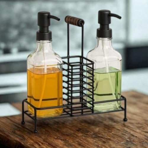 2'li Cam Dispenser Seti – Metal Taşıyıcılı Sıvı Sabun & Deterjan Pompa Şişeleri, Endüstriyel Mutfak & Banyo Organizer