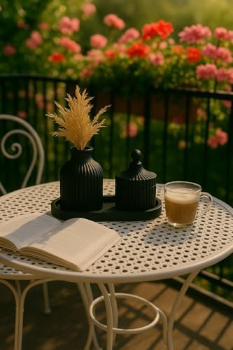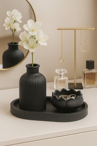 TASARIM: Minimalist çizgiler, beyaz tonlar ve pürüzsüz yüzey. SET İÇERİĞİ: Çizgili vazo (10×7 cm), kapaklı mumluk (8×8 cm), oval tepsi (18,2×9,5 cm). MALZEME: & seramik karışımı – dayanıklı, hafif ve el yapımı. KULLANIM ALANI: Salon, yatak odası, banyo, ofis, giriş holü ve yemek masası dekorasyonu. EL İŞÇİLİĞİ: Tek tek elde üretilmiş; her parça küçük farklılıklarla benzersizdir. 3 Parçalı Siyah Dekoratif Set – Çizgili Vazo, Kapaklı Mumluk & Oval Tepsi