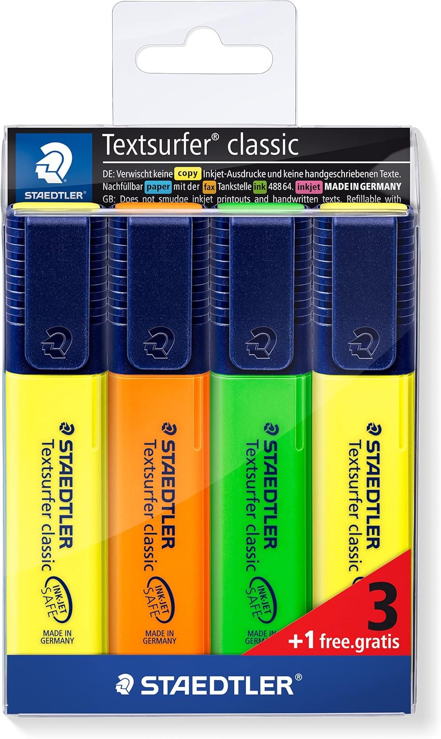 Menşe Ülke: Almanya Su bazlı neon mürekkep; hızlı kurur; ekstra uzun işaretleme performansı için büyük mürekkep hazneli işaretleme kalemi safe: inkjet yazıcılardan çıkan kağıtlar ve elle yazılmış metinlerde güvenle kullanılır; kağıt üzerindeki mürekkebi dağıtmaz; kağıt, faks ve karbon kopyalara için uygundur Copy proof; turkuaz ve mor renkleri faks ve fotokopide görünür Uçakta güvenli; otomatik basınç eşitleme sistemi ile mürekkebin sızmasını engeller; hafif bir çevirme hareketi ile kolay açılan kapak; Almanya üretimi 'Made in ' 364S Wp4P Textsurfer Highlighter 4'lü Blister 3 Renk 1 Renk Bedelsiz