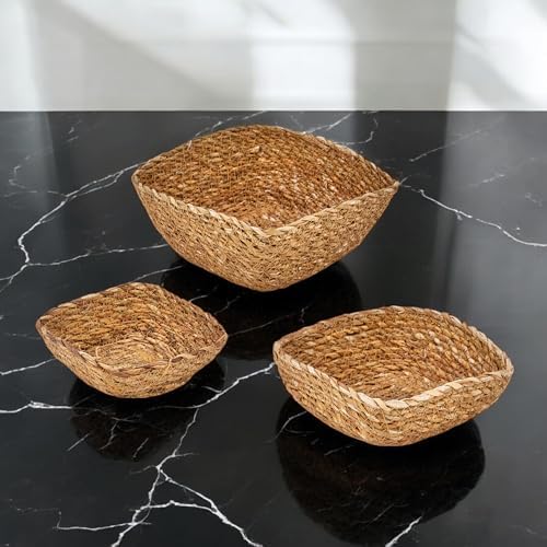 3'lü El Yapımı Hasır Kare Dekoratif Çerezlik Meyvelik, Dekoratif Amaçlı Mini Hasır Sepetler (16cm*16cm*7cm-14cm*14cm*6cm-12cm*12cm*5cm)