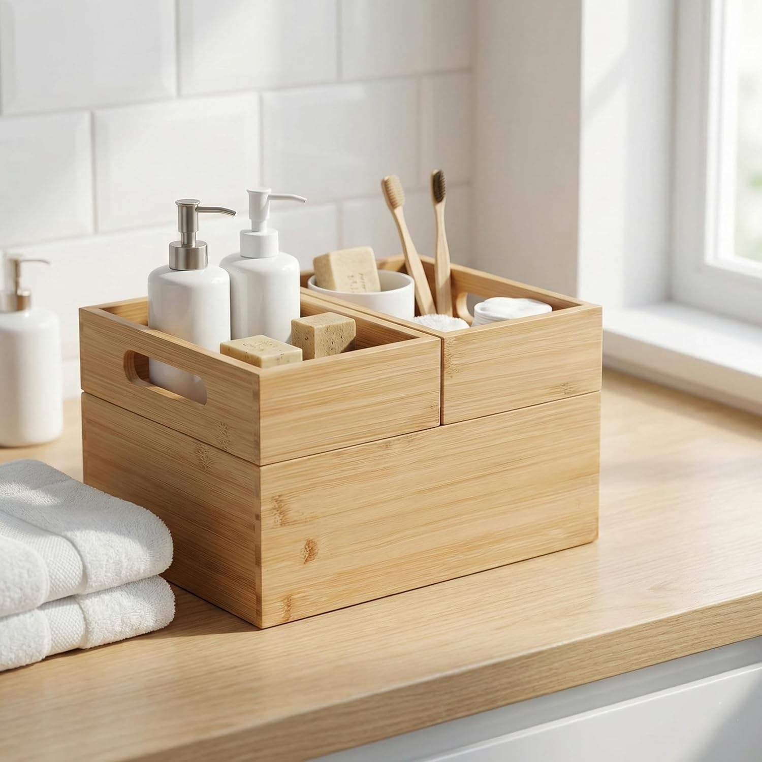 3'lü Modüler Bambu Organizer Set – Üst Üste Geçebilen Çok Amaçlı Çekmece İçi ve Masaüstü Düzenleyici Kutu – Banyo, Mutfak ve Ofis İçin Ahşap Saklama Seti