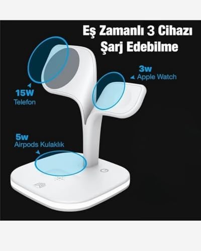 Gece Aydınlatma Özelliği: Gece boyunca cihazlarınızı rahatça şarj edebilmeniz için yumuşak bir ışık sunar, aynı zamanda estetik bir atmosfer yaratır. Kablosuz Şarj Teknolojisi: Kablolara veda edin! Şarj standı, kablosuz şarj teknolojisi sayesinde daha az dağınıklık ve daha fazla düzen sağlar. Verimli Şarj: Cihazlarınızın bataryasını hızlı ve güvenli bir şekilde doldurun. 16, 16 Plus, 16 Pro, 16 Pro Max, 15, 15 Plus, 15 Pro, 15 Pro Max, 14, 14 Plus, 14 Pro, 14 Pro Max, 13, 13 Pro, 13 Pro Max, 13 mini, 12. SE, 9, 8, 7, 6, 5, 4, 3 series, AirPods 2, AirPods Pro gibi tüm Qi2 uyumlu cihazlar için uygundur. 3'ü 1 Arada 15W Kablosuz Hızlı Şarj Standı Gece Aydınlatmalı ile Uyumlu- ile Uyumlu- ile Uyumlu (Beyaz Hızlı Şarj)