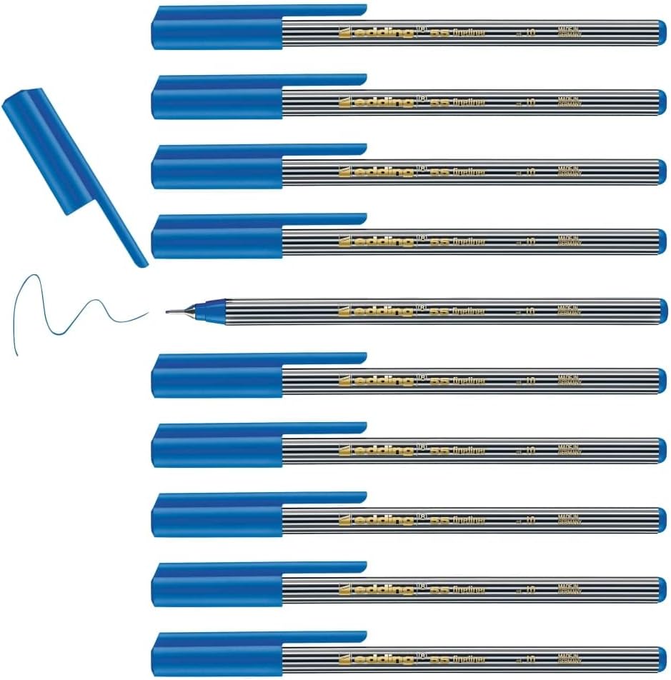 Açık renkli kağıt üzerinde hassas çizim, yazı, eskiz ve mizanpaj çalışmaları için Su bazlı mürekkep çabuk kurur, kuruyana kadar suda çözünür ve bir sonraki sayfaya geçmez Profesyoneller için ya da okulda, evde, ofiste günlük kullanım için ideal 55 – açık mavi – 10 kalem – 0,3 mm uç