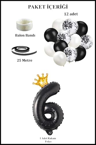 6 Rakam Siyah Folyo Balon, Kral Tacı Ve Konfetili Siyah Balon Set
