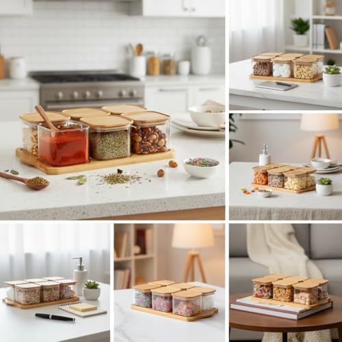 6'lı Bambu Kapaklı Cam Kahvaltılık ve Kuruyemişlik, 13 Parça Tepsili Çerezlik Seti, Vakumlu Kapak (28cm-19cm-8cm)