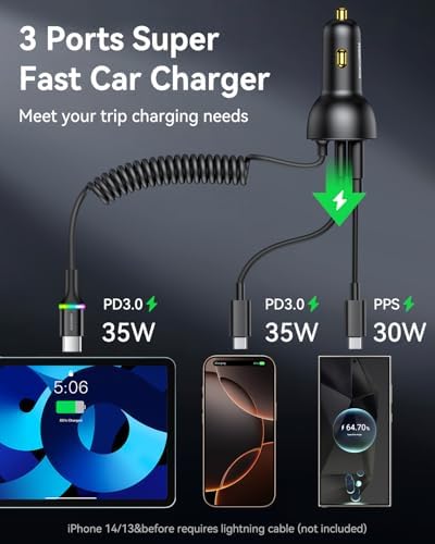 Dahili 35W 5.2 FT Bobinli C Tipi Kablo: PD 35W USB-C Sarmal kabloya sahip usb c kablolu araç şarj cihazı, kabloyu getirmeyi asla unutmamanızı sağlar. Uzatıldığında 160 cm (5,2 ft) ulaşabilir, ihtiyacınızı karşılar. Kablo sarıldığında, sadece yer kaplamakla kalmaz, aynı zamanda dağınık kabloları düzenleme veya arama ihtiyacını ortadan kaldırarak daha fazla zaman kazandırır. hediyeleri için iyi bir seçim, sadece erkekler için hediyeler değil, aynı zamanda kadınlar için de hediye olabilir 35W USB C ve 30W USB A: USB-C bağlantı noktaları (PD3.0) 35W Max çıkış yapabilir ve USB-A bağlantı noktaları (QC4.0) ayrı ayrı kullanıldığında 30W Max çıkış yapabilir. araç şarj cihazı, 16 ila% 60 ve S25 Ultra'yı sadece 30 dakika içinde% 65'e kadar hızlı şarj edebilir Çoklu Şarj Korumaları: Bu çakmak usb c şarj cihazı, PC'den yapılmış FCC, CE ve ROHS tarafından sertifikalandırılmıştır. Alev malzeme, takılı cihazları otomatik olarak tanımlayabilen ve optimum şarj gücünü dağıtabilen dahili akıllı entegre çip, cihazlarınızı aşırı voltaj, aşırı akım, aşırı şarj, aşırı ısınma, kısa devreden koruyabilir, tüm sürüş süreci boyunca güvenliği sağlar Geniş Uyumluluk: 16/15/14/13/12/11 Serisi, iPad Pro/Air/mini Serisi, S25/S24/S23/S22/S21, 9/8/7/6, MacBook Air M2/M1/2020/2019/2018 (Sadece 24V modeller için kamyonlar gibi), kablosuz araç şarj cihazı montajı, anahtar, AirPods, Smartwatches, sürüş kaydedici, GPS navigasyon, araba elektrikli süpürge, güç bankaları ve diğer cihazlar Teslimat kapsamı: 1 x 70 W 2 bağlantı noktalı USB araç şarj cihazı, dahili 1,6 m C Tipi Kablo Kablosu, 1 * Kullanım Kılavuzu ve çok yıl garantimiz. 24 saat* 7 ve mükemmel satış sonrası müşteri hizmetleri sunuyoruz 70W 3 Portlu 2*Type-C 1*USB-A Spiral Kablolu LED Işıklı Araç İçi Hızlı Şarj Cihazı