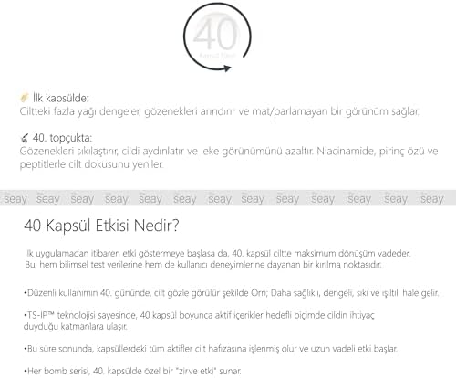 Ne İşe Yarar? Cilde arınmış, dengelenmiş ve sıkı bir görünüm kazandırmak için geliştirilmiş kapsüllü bakım sunar. İçeriğindeki aktif kapsüller, yağlı ve gözenekli bölgelerde sebum dengesini sağlar, leke görünümünü azaltır. TS-IP teknolojisi (Akıllı Kapsüller) sayesinde cildin ihtiyaç duyduğu bölgelere aydınlatıcı ve sıkılaştırıcı içerikler hedefli olarak taşınır. Cildin yağ dengesini, gözenek yoğunluğunu ve donukluğunu analiz ederek doğru aktifleri doğru bölgeye iletir. Su bazlı hafif dokusu sayesinde hızla emilir, ciltte ağırlık yapmaz ve ferah bir kullanım sunar. TÜRKİYE’DE BİR İLKE DAHA: PIRIL PIRIL BİR CİLT İÇİN PİRİNÇ GÜCÜ! Sıkıştırılmış Rice Bomb Topçuklarıyla Cilt Temizliğinde Devrim! Cilt bakımında bilimsel bir adım daha attık! Pirinç nişastası ve niasinamid gibi aktiflerle özel olarak geliştirilen Rice Bomb kapsülleri, orta büyüklükte sıkıştırılmış topçuk yapısıyla, içeriğindeki aktifleri dış etkenlere karşı koruyor. Bu sayede, gözenek sıkılaştırma, yağ dengesi ve aydınlatıcı etki sağlayan bileşenlerimiz ışık, hava, sıcaklık ve nem gibi yıpratıcı faktörlerden etkilenmeden cildinize ulaşır. Bu yenilikçi yaklaşımımızın sonuçları oldukça etkileyici: Doğrudan cilt teması halinde yapılan analizler, bu özel formülasyonumuzun, standart akışkan kremlere göre %78 oranında daha yüksek bir etki gösterdiğini ortaya koymuştur. Cildinizin en saf ve en güçlü etkiden yararlanması için içeriklerin etrafa dağılmamasını ve tek bir topçuk içinde toplanarak maksimum etki göstermesini sağladık. TS-IP (Targeted Skin-Intelligent Penetration), The Seay tarafından geliştirilen, aktif içeriklerin cilde hedefli ve maksimum etkiyle iletilmesini sağlayan ileri seviye bir taşıma teknolojisidir. Klasik üretimde içerikler kazanda karıştırılır, aktif maddeler baz (örneğin su) içinde dağılır ve etkisi zayıflar. TS-IP ise her aktif maddeyi özel mikro kapsüller içine enjekte eder. Bu kapsüller ciltle temas ettiğinde çözülür ve içerikler doğrudan hedef katmana taşınır. Böylece maksimum etki, stabilite ve sonuç sağlanır. Akıllı Kapsül Krem – Arındırıcı & Aydınlatıcı Etki, Gözenek Sıkılaştırıcı | TS-IP™ Teknolojisi