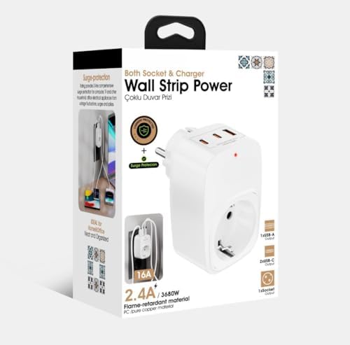 Akım Korumalı Priz 1x Priz, 2x Type-C, 1x USB Port Çıkışlı Tekli (Beyaz)