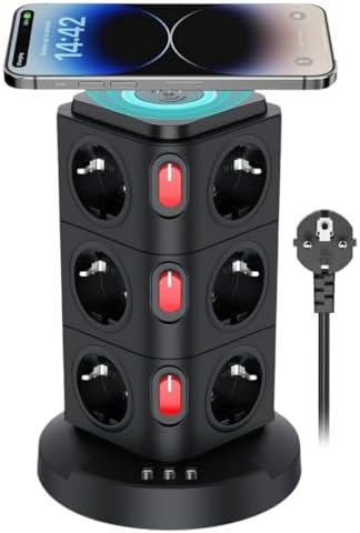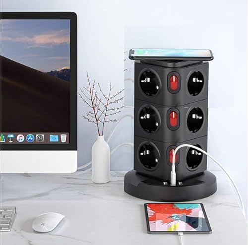 Akım Korumalı Priz Kule Tipi Kablosuz Şarj İstasyonu 12x Priz, 2x Type-C, 1x USB Girişli 2mt Kablo