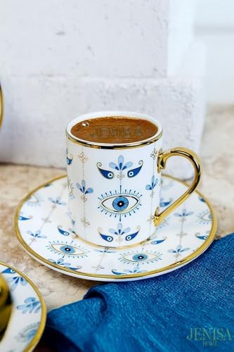 Altın Yaldızlı Nazar Göz Desenli 6 Kişilik Porselen Fincan Takımı – 12 Parça Şık Sunum Seti Evil Eye