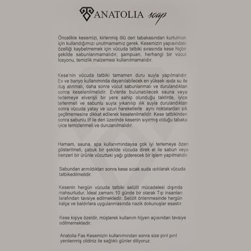 Ürün Tipi: Geleneksel dokuma kese ile cildinizi derinlemesine temizleyin Cilt Bakımı: Ölü deri birikimini ve kirleri gidererek cildinizi yeniler ve canlandırır Kan Dolaşımı: Düzenli kullanımda cilt altı kan dolaşımını hızlandırır ve hücre yenilenmesini destekler Gözenek Temizliği: Tıkalı gözenekleri açar ve cildin nefes almasını sağlar Kullanım Şekli: Ilık duş sonrası sabunsuz cildinize dairesel hareketlerle uygulayarak maksimum fayda sağlar Anatlia soap fas kesesi (yeşil, 1)
