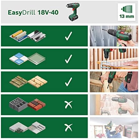 Easy – tüm küçük projeler için kullanışlı yardımcı Optimum performans: 2 vitesli şanzıman ve 20 tork kademesi, uygun vidalama torku ve delme hızı için Kolay vida ve matkap değişimi: 13 mm hızlı sıkıştırmalı matkap aynası ile Çeşitli malzemelerde çok yönlü kullanılabilir: Akülü tornavida, ahşap, metal ve plastik üzerinde vidalama veya delme gerektiren projeler için kullanılabilir Teslimat kapsamı: EasyDrill 18V-40, karton and EasyDrill 18V-40 akülü vidalama makinesi (aküsüz, 18 Volt sistem, kartonda)