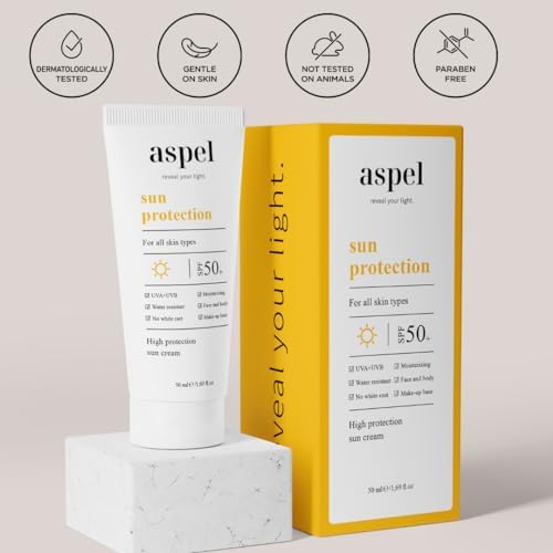 SPF 50+ Suya dayanıklı UVA UVB Koruma Tüm cilt tiplerine uygunluk Nemlendirici Aspel Yüksek Korumalı SPF 50+ Güneş Kremi 50 ml