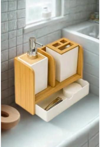 Bambu Kapaklı Yeşil Banyo Seti – Sıvı Sabunluk, Diş Fırçalık, Çok Gözlü Organizer ve Düzenleyici