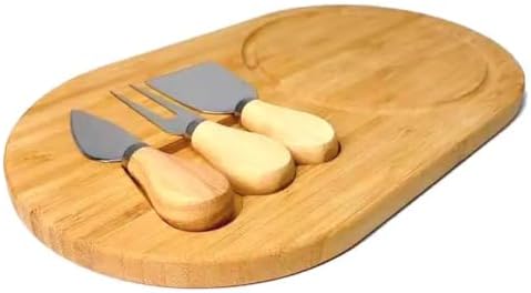 Bambu Peynir Sunum Tabağı, 3 Parça Peynir Bıçağı ve Çatalı Seti, Toplam 4 Parça, Doğal ve Şık Peynir Tabağı, Kaliteli Sunum Seti 34×20 cm Ebatlarında