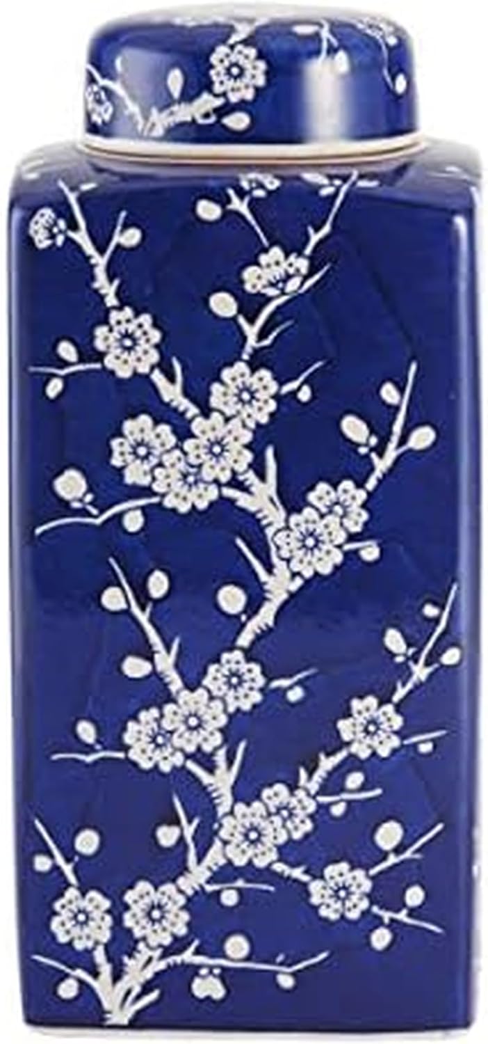 Bombay Kiraz Çiçeği Kapaklı Seramik Kavanoz, 13 cm x 30 cm, Mavi/Beyaz