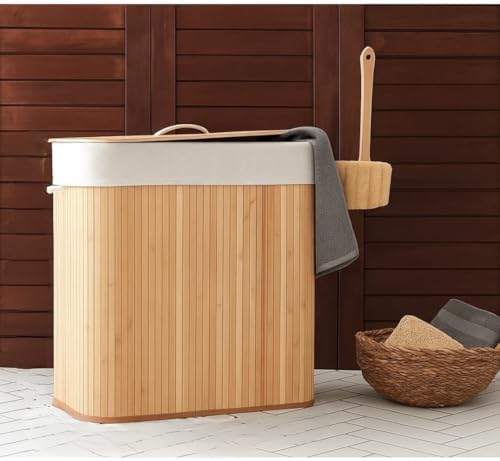 Çamaşır Sepeti Doğal Bambu Katlanabilir Kirlilik, Yıkanabilir Çıkarılabilir Astar Torbalı, Sele Görünümlü Şık ve Dayanıklı Çamaşır Sepeti, Kapaklı ve Ergonomik Tasarım (2 Bölmeli)
