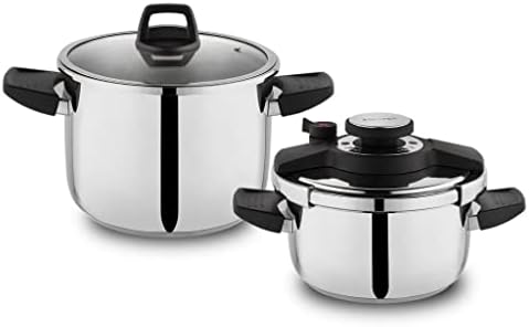 Compact 4 Parça Siyah 2 Li Düdüklü Tencere Seti4 ve 6,5 lt18/10 krom nikel paslanmaz çelik malzemeden üretilmiştir Ergonomik bakalit kulplara sahiptir Kapaklar iki tencereye de uyumludur Kapsül tabanlıdır. Compact Düdüklü Ten.Seti -2 Li-4 Prç-Siyah