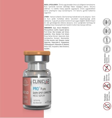 KULLANIMI: Ürünü uygulamadan önce yüz bölgesini temizleyiniz. Kutu içerisinde bulunan damlalığı flakon başlığına takınız. Serumu cildinize 1-2 dakika masaj yaparak uygulayınız. Ürünü uygulandıktan sonra yıkamayınız veya durulamayınız. Cilt Serumu günlük kullanıma uygundur UYARILAR: Haricen kullanılır. Göz ile teması halinde bol su ile yıkayınız. Serin ve kuru yerde muhafaza ediniz. Çocukların ulaşamayacağı yerde saklayınız. 3 yaş altı çocuk kullanımı için uygun değildir. Beklenmeyen bir etki görüldüğünde doktora danışınız. Ürün içeriğindeki herhangi bir maddeye karşı hassasiyeti olan kişilerin kullanması tavsiye edilmez. İÇİNDEKİLER: Aqua, Arbutin, Maltodextrin, Phenoxyethanol, Lecithin, Capparis Spinosa Fruit Extract, Olea Europaea Leaf Extract, Lysolecithin, Citrus Sinensis Fruit Extract, Oryza Sativa Extract, Hyaluronic Acid, Lactobacillus Ferment, , 3-O-Ethyl Ascorbic Acid, Potassium Azeloyl Diglycinate, Polyacrylate-13, Polyisobutene, Ethylhexylglycerin, Polysorbate 20, Bisabolol, Phytic Acid, Tocopherol, Beta-Sitosterol, Squalane. Dark Spot Corrector Meso Serum 6 ml x 10 adet