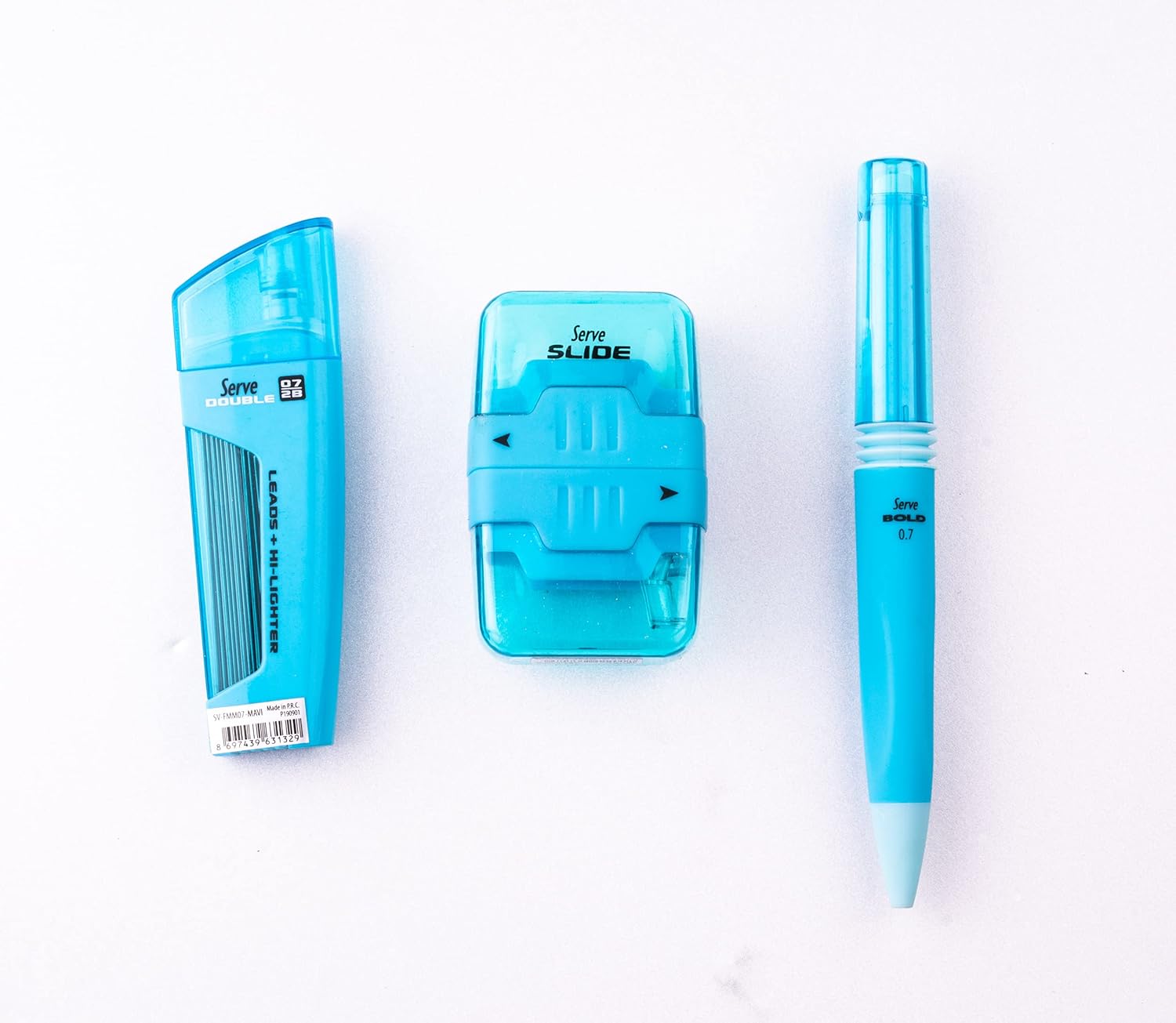 Mekanik Kurşun Kalem 0,7mm Konforlu yazim sağlayan kalin gövde ile Ergonomik kullanim için kauçuk gövde tasarimına sahip Double fosforlu kalemli min 2 ürün bir arada Yüksek kalitede 80 adet min ve Fosforlu kalem bir arada Silgi&kalemtiraş bir arada,Toz ve iz birakmayan silgi,Uzun süreli kullanim sağlayan dayanikli kalemtiraş Mavi Renk 3'lü Kalem Seti &Dbl-Fos Klm&Slide Slgktrs 07 Mav 3l