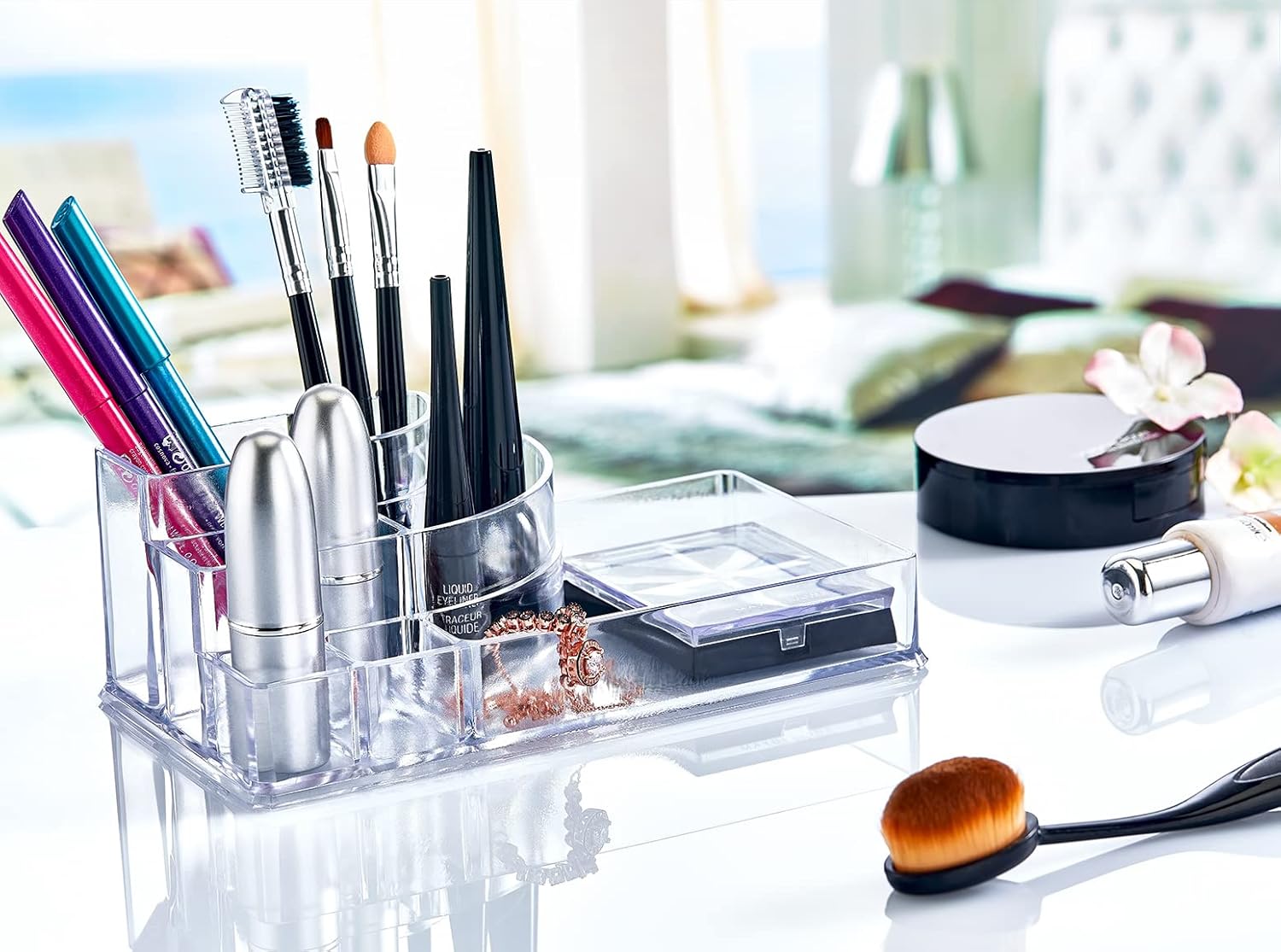 Akrilik Makyaj Organizeri Şeffaf Makyaj Organizeri 18*10*10,5cm Özel Üretim 8 Bölmeli Deconox 8 Bölmeli Podyum Kozmetik Ürün Düzenleyicisi, Podyum Şeklinde Akrilik Makyaj Organizeri