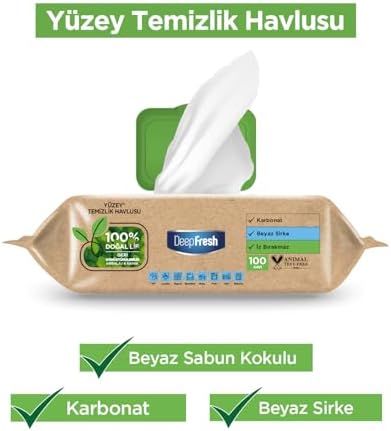 Beyaz sirke ve karbonat içeren doğal içeriği sayesinde, sık temas edilen yüzeylerde durulama gerektirmeden ve iz bırakmadan temizlik sağlamaya yardımcı olur Kullan-at özelliği sayesinde pratik ve hijyeniktir. Ekstra büyük, ekstra kalın özelliği sayesinde, tek yaprak ile mükemmel temizlik sağlar. Evde ve dış mekanlarda temas edilen tüm yüzeylerde hijyen sağlamaya yardımcı olur. Paraben, SLES ve SLS gibi zararlı kimyasallar içermez. Deep Fresh DeepFresh İz Bırakmaz Yüzey Temizleme Havlusu, Karbonat & Beyaz Sirke, Beyaz Sabun Kokulu (100 Yaprak)