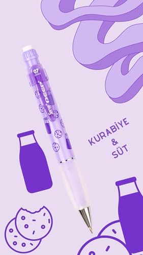Yüksek Kaliyesiyle Üretilmiştir Çevirince Ortaya Çıkan Kaliteli Silgi Gizlenebilir Uç Mekanizması İle Güvenli Kullanım,Ergonomik Grip Rahat ve konforlu kullanım sunar Deep Süt & Kurabiye Baskılı Mekanik Versatil Kalem 0.7 Lavanta