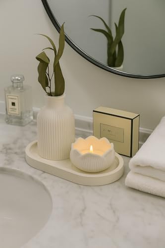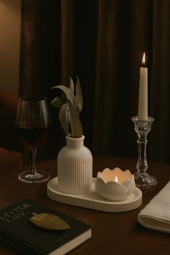 TASARIM: Doğadan ilham alan lotus motifi; minimalist & modern detaylar. SET İÇERİĞİ: 1 vazo (10×9 cm), 1 beton tepsi (18×9 cm), 1 lotus mumluk (7×4 cm). MALZEME: Dayanıklı beton; uzun ömürlü, el yapımı özgün dokuya sahip. KULLANIM ALANI: Salon, yatak odası, banyo, ofis ve özel gün dekorasyonları. EL İŞÇİLİĞİ: Her parça tek tek üretilmiş olup benzersiz doku ve renk farklılıkları taşır. Dekor Seti – Estetik ve Zarafetin Buluşması