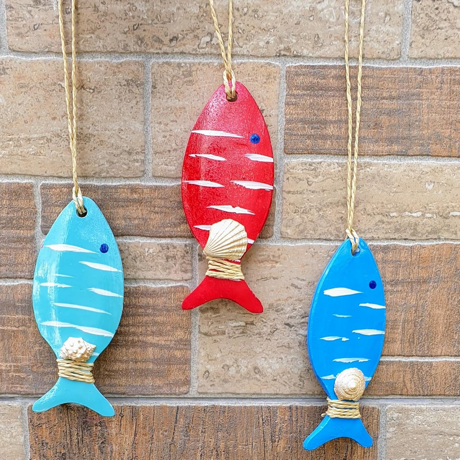 Dekoratif Balık Duvar Süsü, 3'lü Set, Kırmızı ve Mavi Tonları, Deniz Kabuğu Detaylı