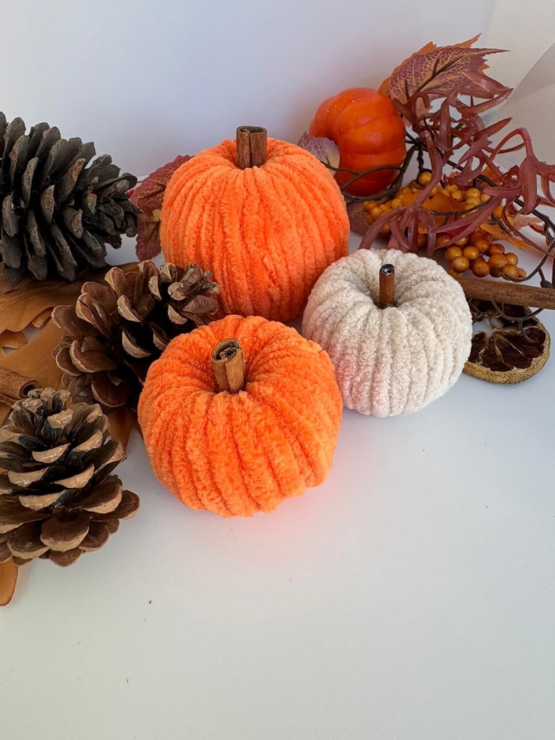 Dekoratif Balkabağı Seti – 3’lü El Yapımı | Turuncu & Krem Yün İplikten