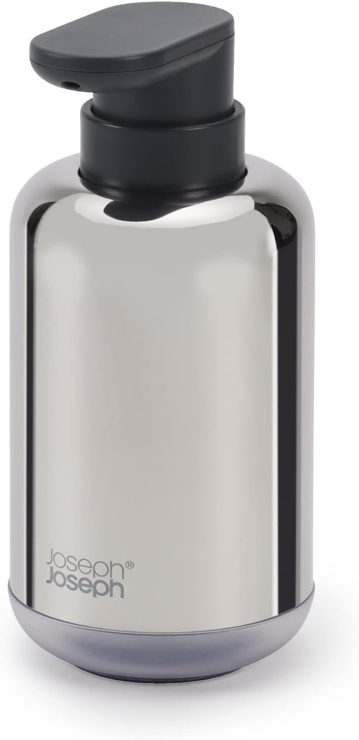 Tabanında neredeyse boş olduğunu gösteren şeffaf bir pencere bulunur ve dolumu ve temizliği kolaydır. Parlak paslanmaz çelik kaplaması dayanıklıdır ve banyoda gerçek bir görsel sunar Parlak paslanmaz çelik kaplama kolay itme pompalı başlık Kolay dolum ve geniş kapasite: 300 ml Kaymayı önleyen taban EasyStore Luxe Sıvı Sabunluk, Paslanmaz Çelik