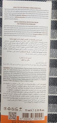 Güneş kremi Kooruyucu ve nemlendirici Güvenlik uyarısı: Açık ürünü kullanmayınız. Ecran Solaire Renkli Güneş Koruyucu Krem 75 ml Lekeli Ciltler İçin