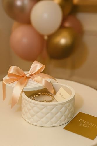 TASARIM: Kabartmalı yüzey, zarif kapak detayı; modern ve zamansız şıklık. SET İÇERİĞİ: 1 adet kapaklı kutu – Çap 13,4 cm | Yükseklik 5,7 cm. MALZEME: /kompozit karışımı; sağlam, uzun ömürlü ve el işçiliğiyle üretilmiş. KULLANIM ALANI: Salon, yatak odası, makyaj masası, ofis; takı, pamuk veya küçük eşyalar için. EL İŞÇİLİĞİ: Her parça özenle el işçiliğiyle üretilmiş olup benzersiz doku ve detaylara sahiptir. Elegance Bow Serisi – Kapaklı Dekoratif Kutu