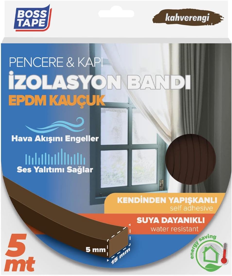 Pencere ve kapi yalitim bandi Kapi ve pencereler arasindaki bosluklari kapatarak hava geçisini engeller Ses ve isi yalitimi saglar Suya dayaniklidir ve uzun ömürlüdür EPDM Kauçuk Pencere Kapi Izolasyon Bandi, 5mm X 15mm X 5mt Boyut, Kahverengi