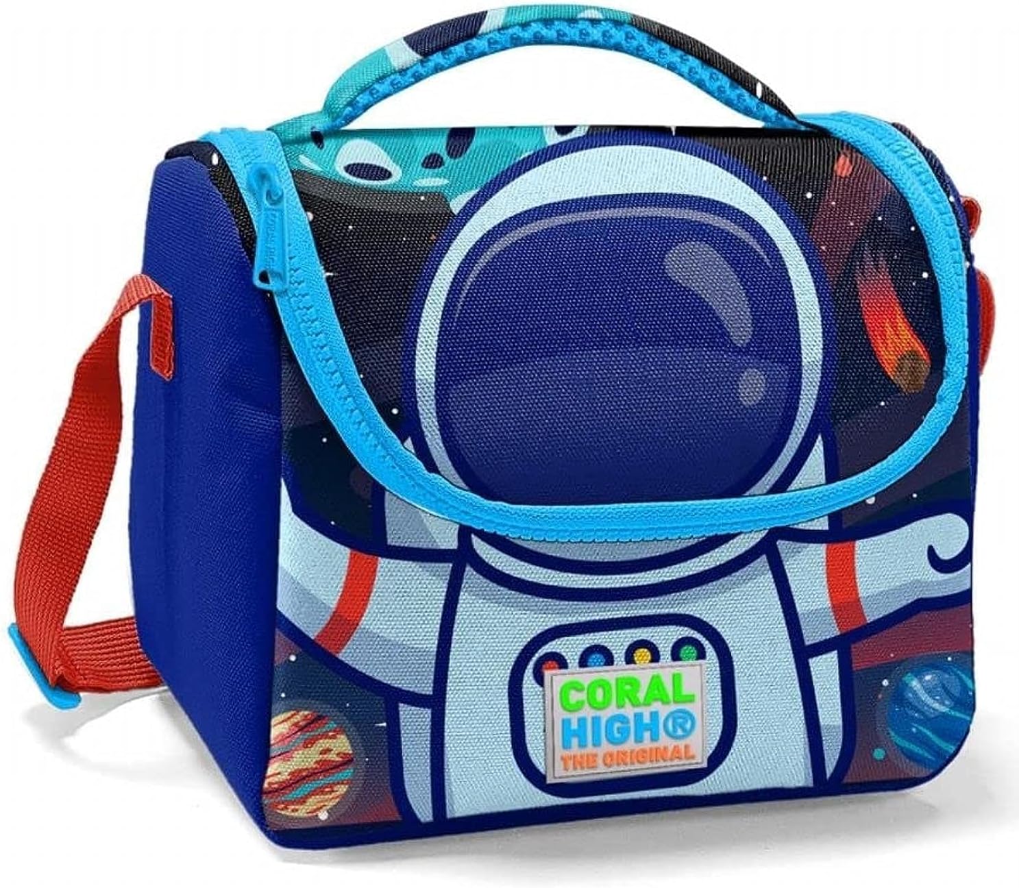 Çantanın fermuar bölümü daha sağlam ve güvenli olması için çift fermuar sürgüsüne sahiptir Kapağının üzerinde 25 mm'lik malzemeden elde tutma kulbu vardır Omuz askısı ağırlığa dayanabilecek ve kullanıcının omuz boyuna göre ayarlanmaya yardımcı olacak bir ayar tokası ile özel olarak üretilmiştir Çantanın tüm iç yüzeyi ısıya dayanıklı alüminyum izolasyon malzemesi ile kaplıdır Çantanın tüm iç izole kaplaması ile dış kumaş yüzeyi arasında 5mm kalınlığında içerideki malzemelerin ısısını koruyacak ve hassas yüklerinizi darbelere karşı korumaya yardımcı olacak köpük ile kaplanmıştır Erkek Çocuk Mavi Astronot Okul ve Piknik Beslenme Çantası