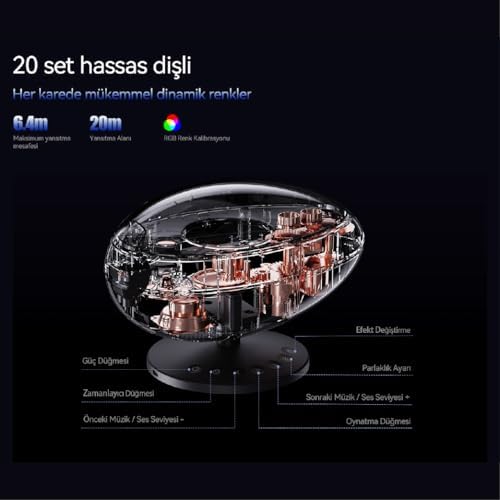 Bluetooth: Bluetooth 5.0 bağlantı desteği Güç Arayüzü: Type-C bağlantı noktası Yansıtma Alanı: 20 metreye kadar Otomatik Kapatma: Var Aydınlatma Modları: Ay spektrumu, beyaz gürültü, kutup ışıkları, mavi yıldız denizi, yıldızlı gece Eva Galaksi Projeksiyon Gece Lambası 4 Farklı Gökyüzü Modu Bluetooth Hoparlör