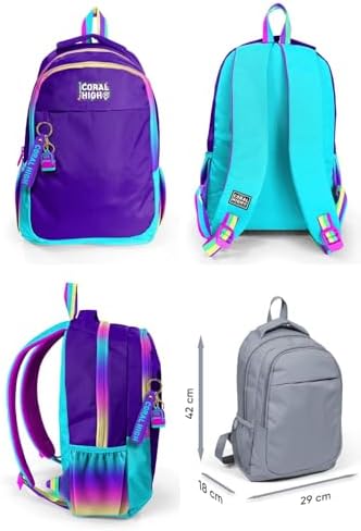 Farklı renk ve desenler ile tasarlanmıştır Çantanın yan kısımlarında 2 adet esnek file malzemeden suluk ve aksesuar cebi bulunmaktadır Üç bölmeli sırt çantası Çantanın ana gözü çift fermuar sürgüsü ile kapatılır Çantanın omuzluk bölümleri 3 ayrı katmandan oluşmaktadır Fermuarlı Mor İlkokul Ortaokul ve Günlük Sırt Çantası – Kız Çocuk