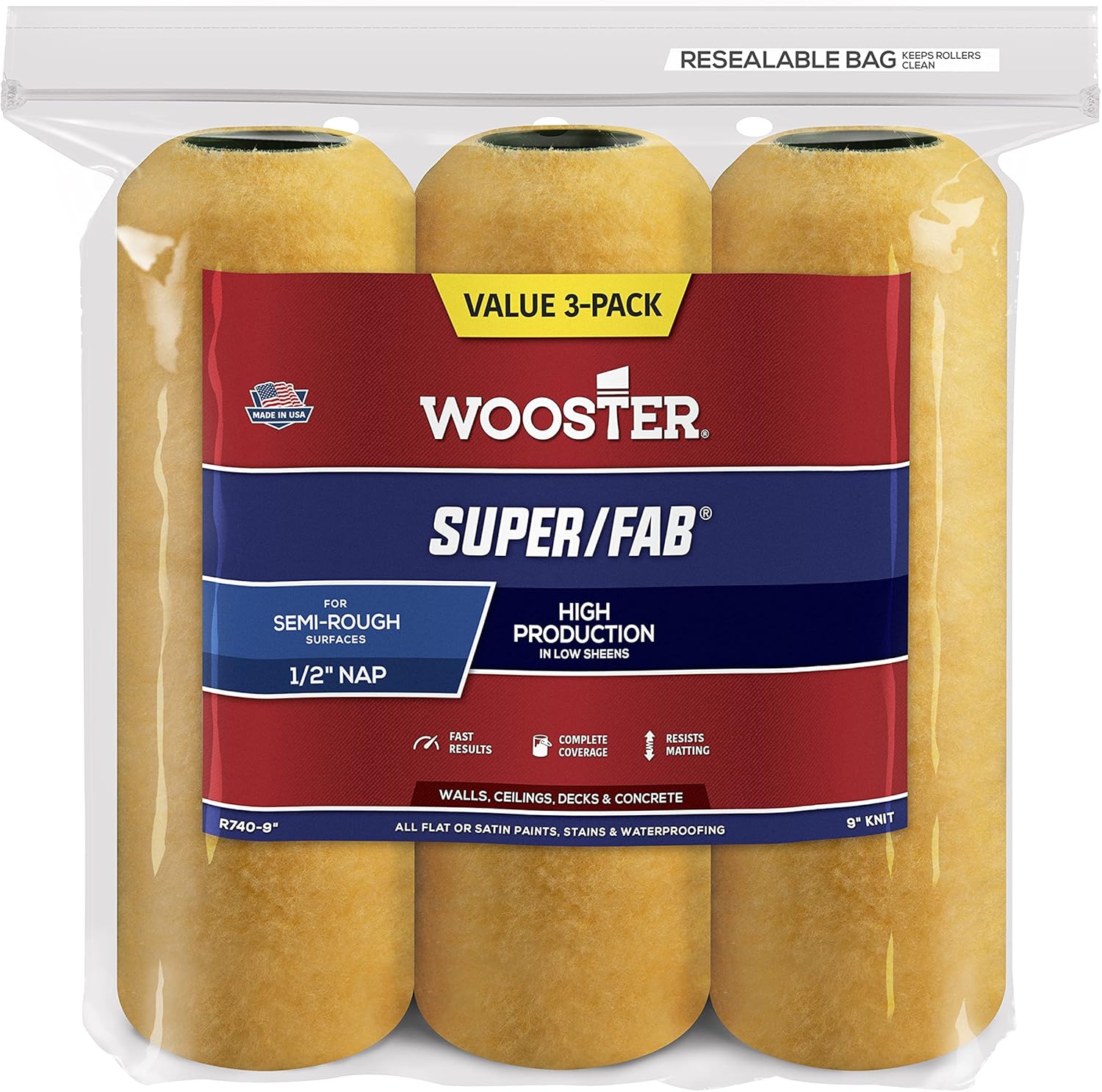 Vekalet altın sarı kumaş, sıradışı kapasite ile tüm düz veya saten cilalar lekelerini ve sızdırmazlık Pürüzlü paspas komple Kapak Yumuşak sonuçlar yükleniciler paketlenmiş bir göz alıcı poli torba başlığı fırça mini-halojen R740 – 9 Super/FAB Roller, 1/2 inç NAP, 3'lü paket, 9 inç