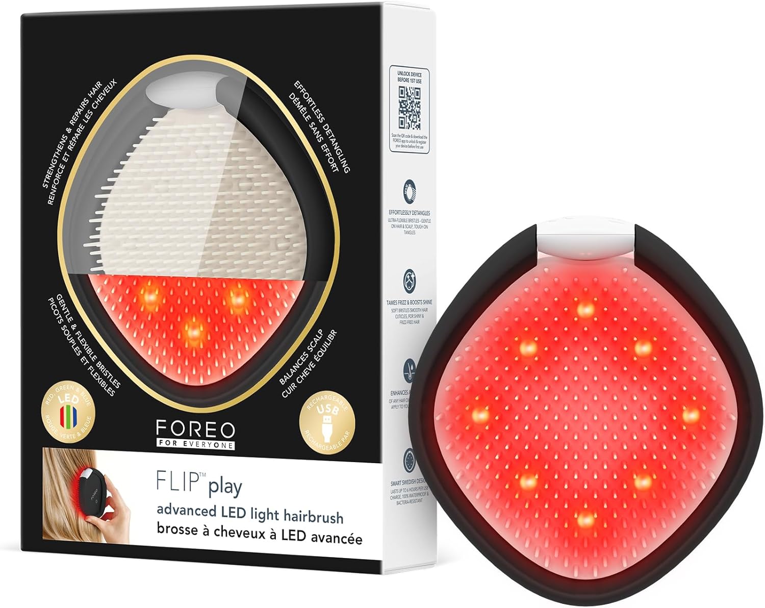 FLIP Play Advanced LED Saç Fırçası – Kırmızı, Mavi ve Yeşil ışık modlarına sahip 3’ü 1 arada bakım aracı, sağlıklı görünen saç ve saç derisini destekler – Midnight Magic!